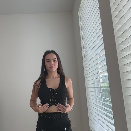 - Front tie detail with metal eyelets, inspired by the corset style.