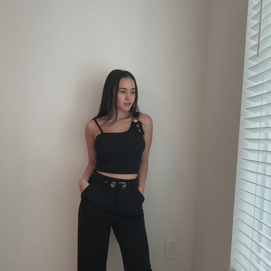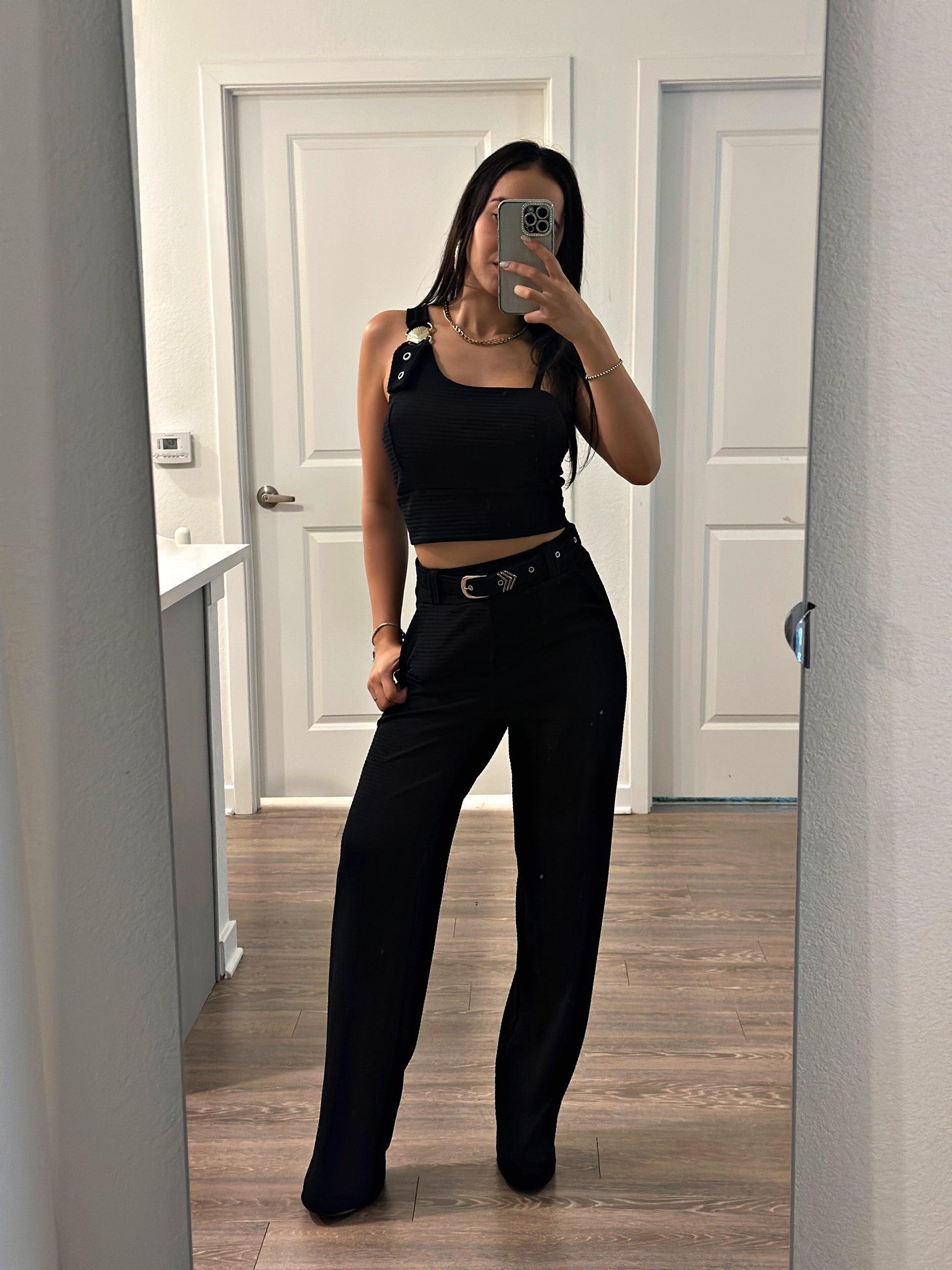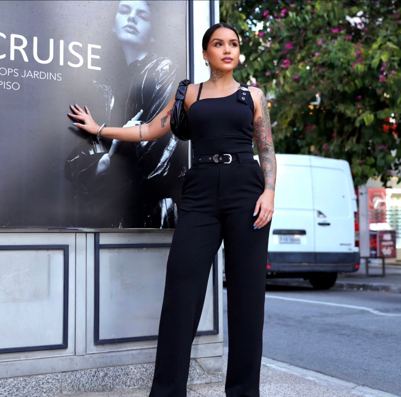 - Pants: Straight cut, high waist and refined finish, lengthening the silhouette.
